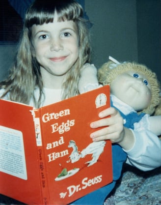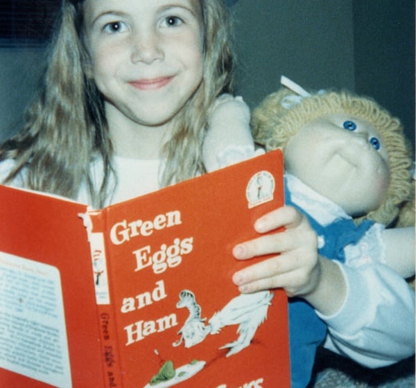 Tara reading Green Eggs and Ham to her Cabbage Patch doll.